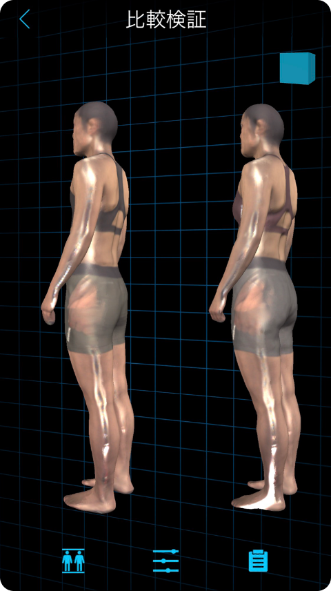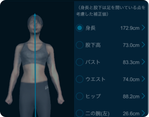 - 150万の点群データで捉えた人体形状を、フィットネス、整体、マッサージ、スポーツ・医療ほかヘルスケア分野全般でのボディデータ分析に活用いただけます。