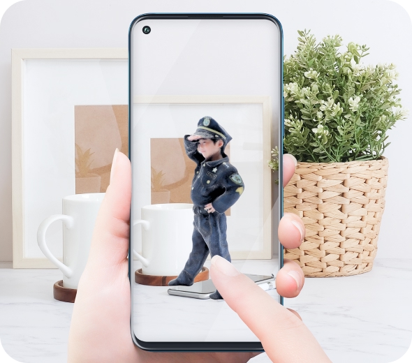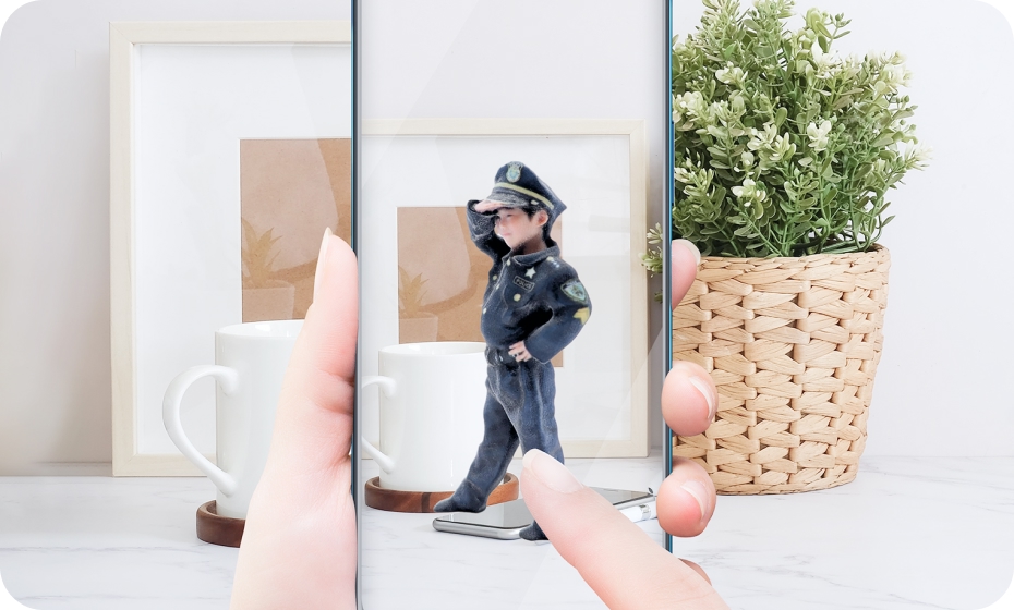 AR機能で現実空間と組み合わせて撮影することができます。ユニークなポーズ、自由な発想でSNSなどオンライン上の新たなコミュニケーションを創出します。