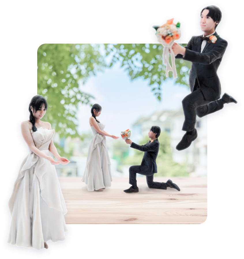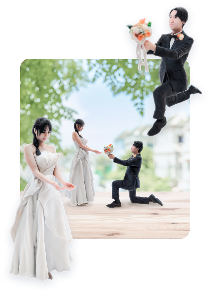 この技術により、この日のために誂えた衣装を身にまとい、今しかないその瞬間を完璧に確実にデータとして保存します。そのデータから精巧につくられた高品質フィギュアは、いつ見ても最高のあの日を思い出す大切なオブジェに。